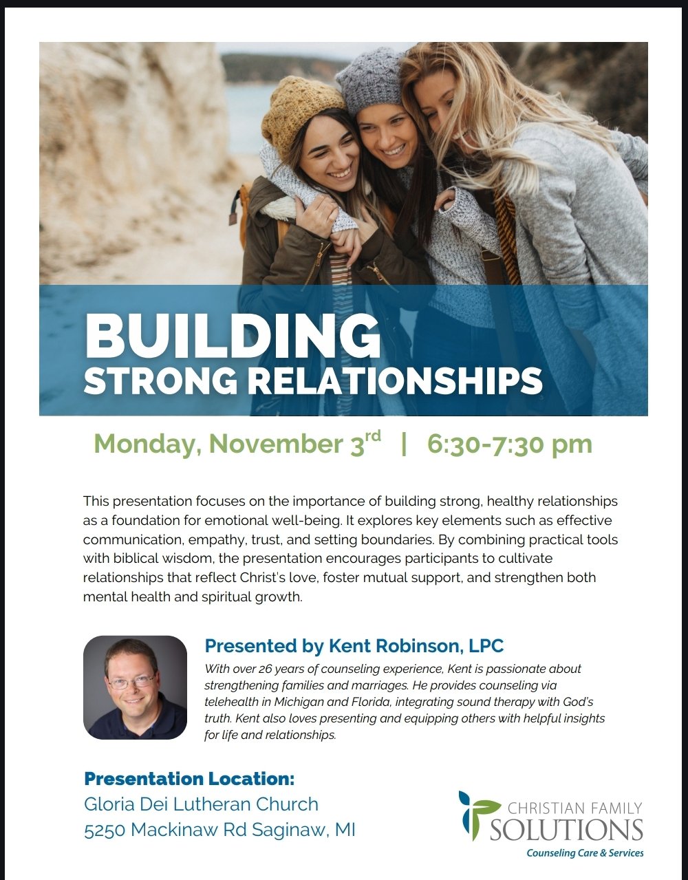 Join us for a workshop on relationships with Kent Robinson, LPC, on Monday, November 3, 6:30 p.m